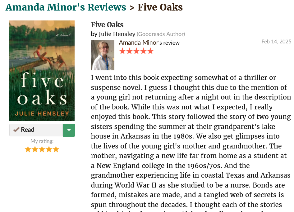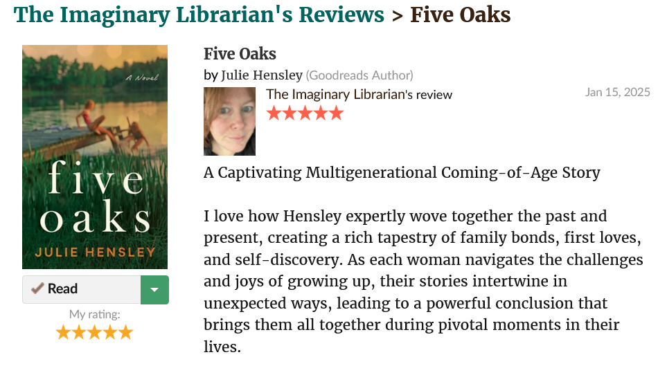“”Julie Hensley’s Five Oaks is a luminous, multi-generational novel that unfolds like a carefully tended garden, revealing its secrets layer by layer…” [read the full review here]