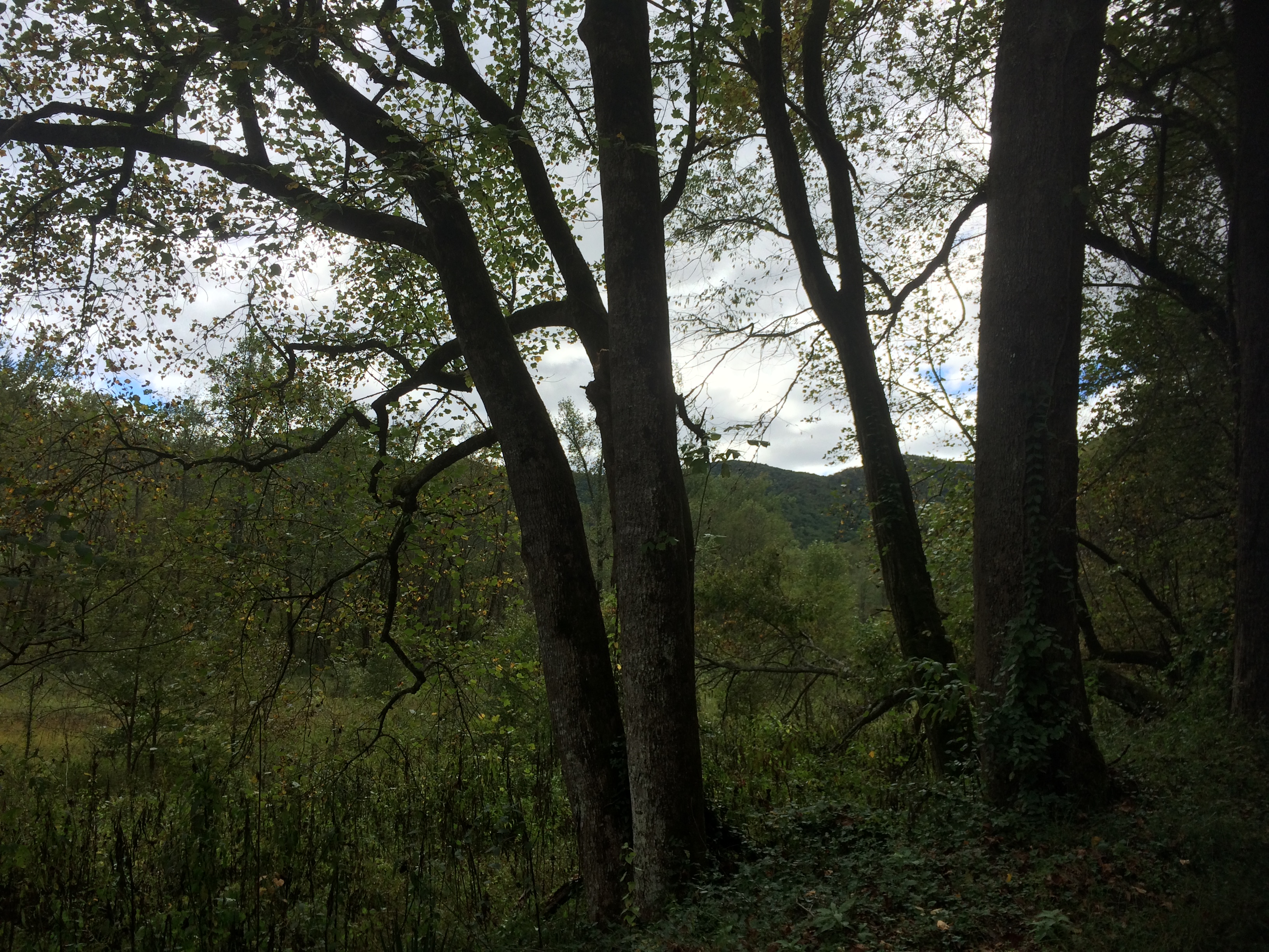 When the sun came out, the leaves began to fall, and I found a lovely rhythm. In the morning, I led yoga classes on the screened porch of Lucinda’s rock house or hiked the waterfall trail. I wrote all afternoon. My desk was in front of a large window, so whenever I looked up from my laptop, there was the golden flurry from the ash and maple trees. One evening, when I drove out of the holler to phone my kids, a double rainbow spread across the farm pastures.